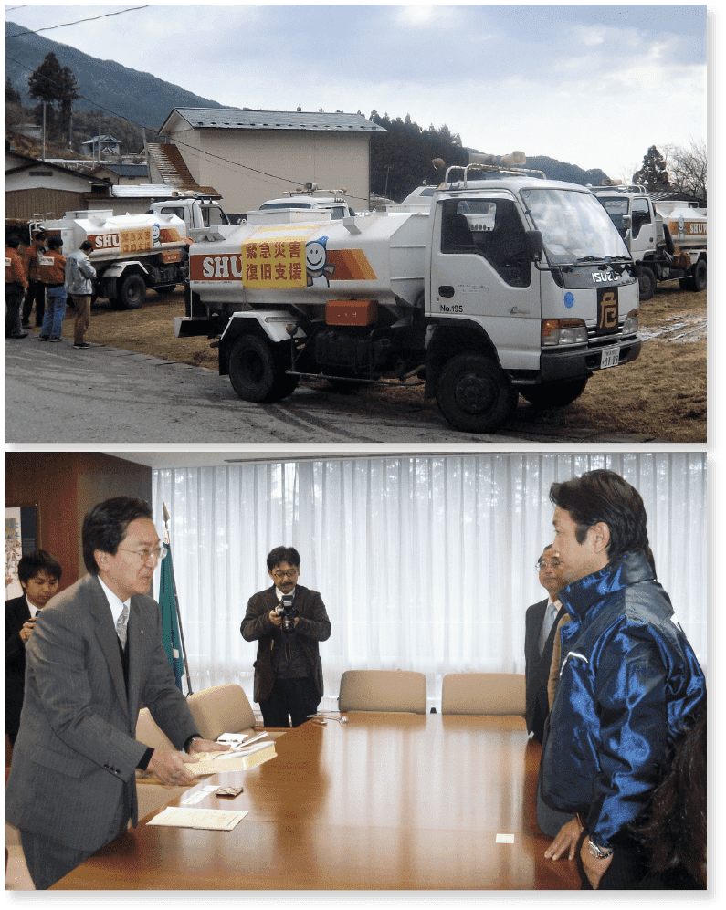 シューワグループは東日本大震災発生直後、内閣府を通じて岩手県災害対策本部から要請を受け、被災地で3カ月間、避難所への暖房用灯油の供給▽自衛隊活動拠点への支援用灯油の供給▽がれき撤去――など燃料供給を中心に復興支援をお手伝いさせて頂きました。