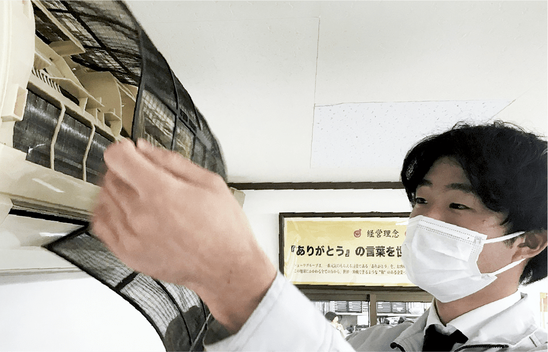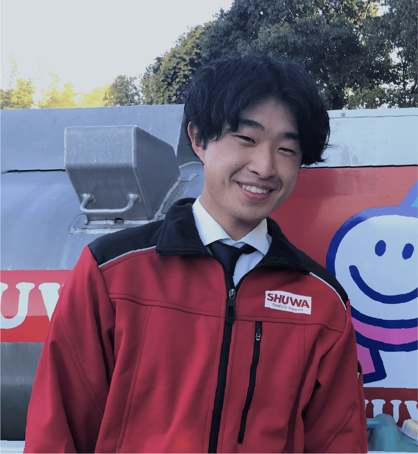 入社後は、エアコンクリーニング(洗浄)などを担当するファシリティ事業部に配属され、エアコンの仕事を半年間担当した後、経験のために堺支店で灯油巡回販売を担当しています。灯油シーズンが終わったら元の部署に戻る予定です。