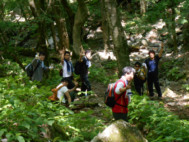 その道は一歩踏み外せば下まで真っ逆さまな危険な道が多く、更に進むと幻想的な沢が広がりそこからは道無き道をひたすら進みます。13時には下山する事ができ、ケガ人も無く皆、無事に大峰山を制覇することができました!