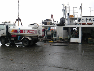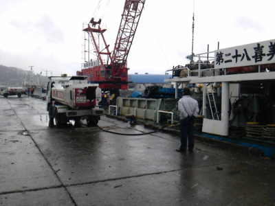 写真は、岩手県宮古市の宮古港でフローティングクレーンと台船に給油中でのものです。