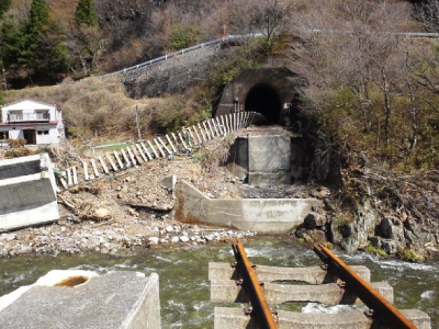 反対側の出口付近は津波で瓦礫が入り込んでいました。その先の鉄橋は、完全に破壊されてました。