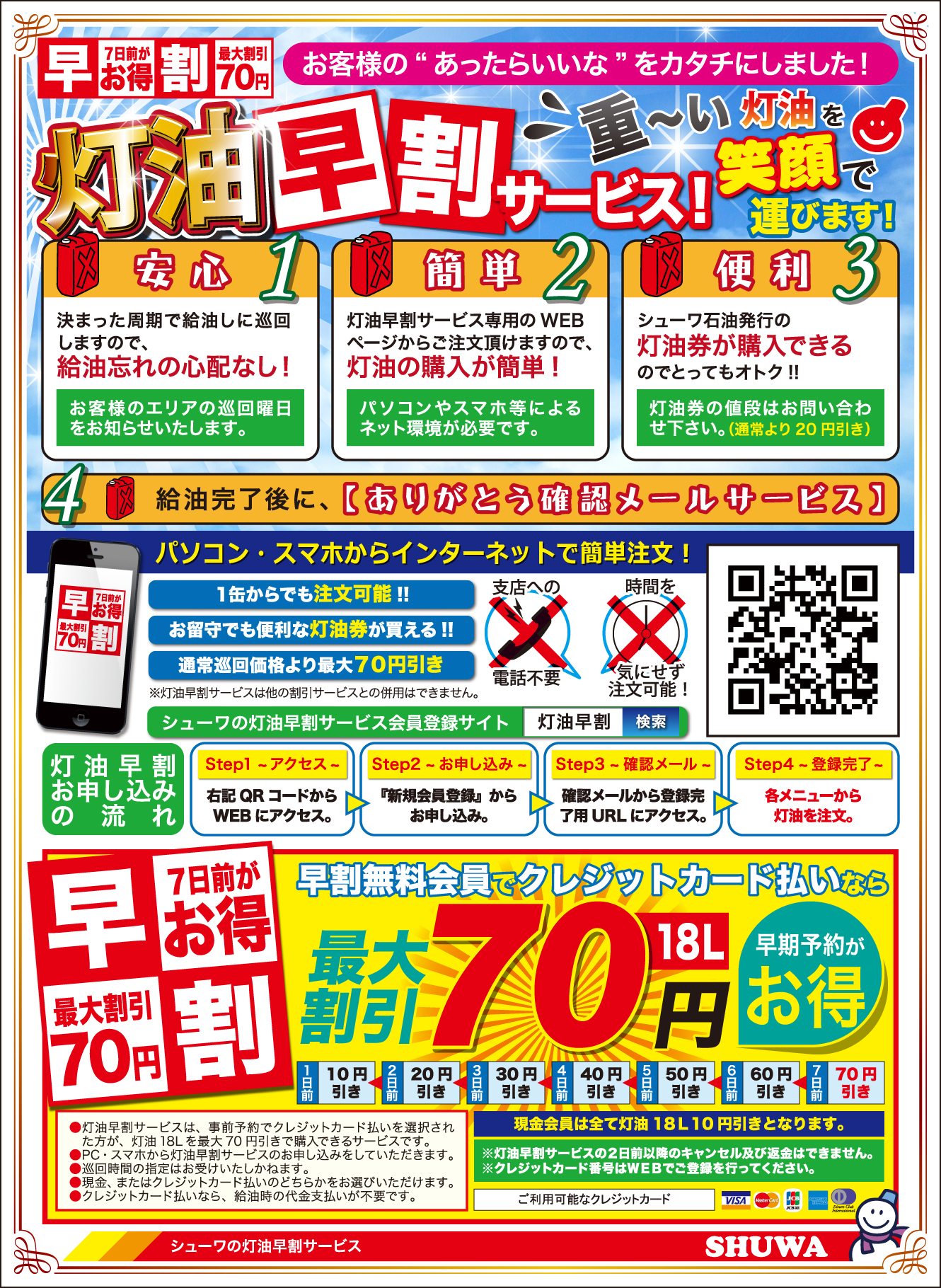 『灯油早割』サービスは『安心』『簡単』『便利』な灯油宅配サービスです。『灯油早割サービス』をご利用いただければ、そんな心配は一切無用です!ご注文方法も簡単!専用のWEBページから簡単に灯油を購入していただけます。(パソコン・スマホにも対応!)『灯油早割サービス』でクレジットカード払いなら1週間前の早期予約で最大70円引きが可能となりました。